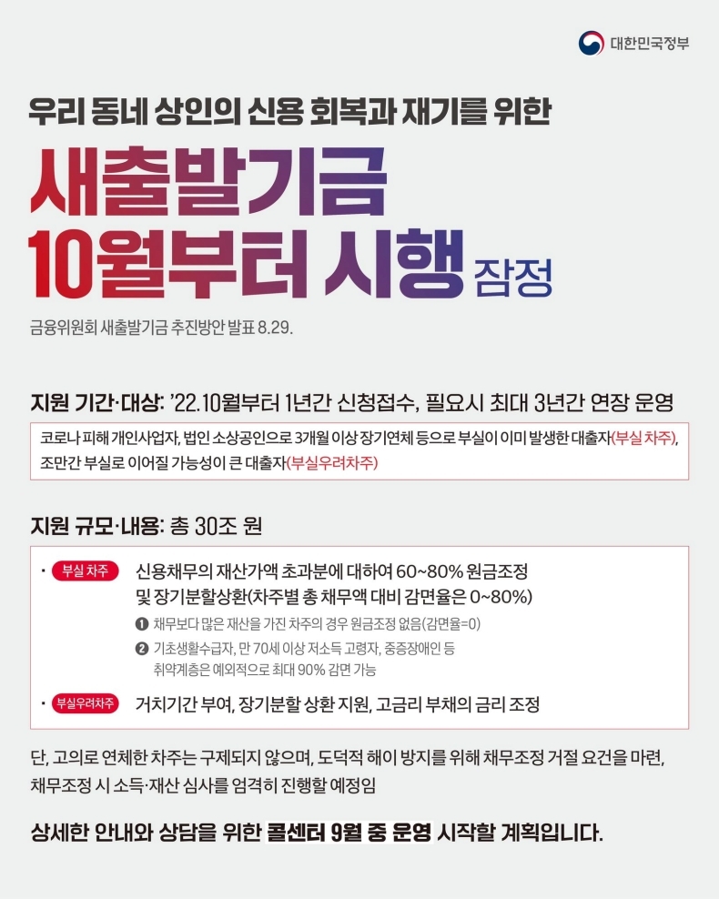 | 지원체계 | 한국자산관리공사 산하 새출발기금(특수목적기구)을 통한 채권 매입형 채무조정 또는 금융사 동의 기반 채무조정 |